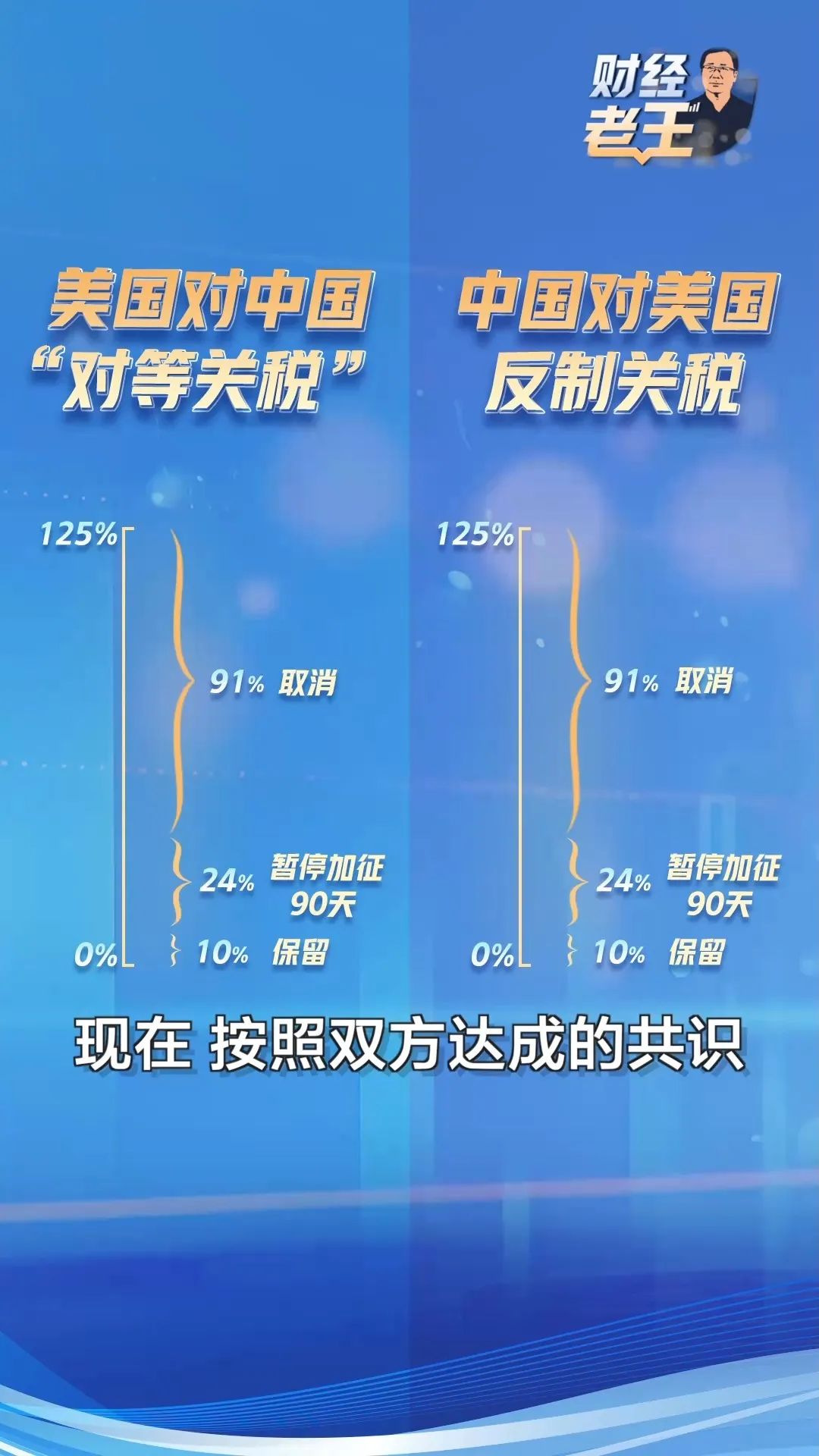现在,按照双方达成的共识,美方取消其中共计91%的加征关税,暂停实施24%的“对等关税”90天。那么,现在美方的对华“对等关税”就是10%。