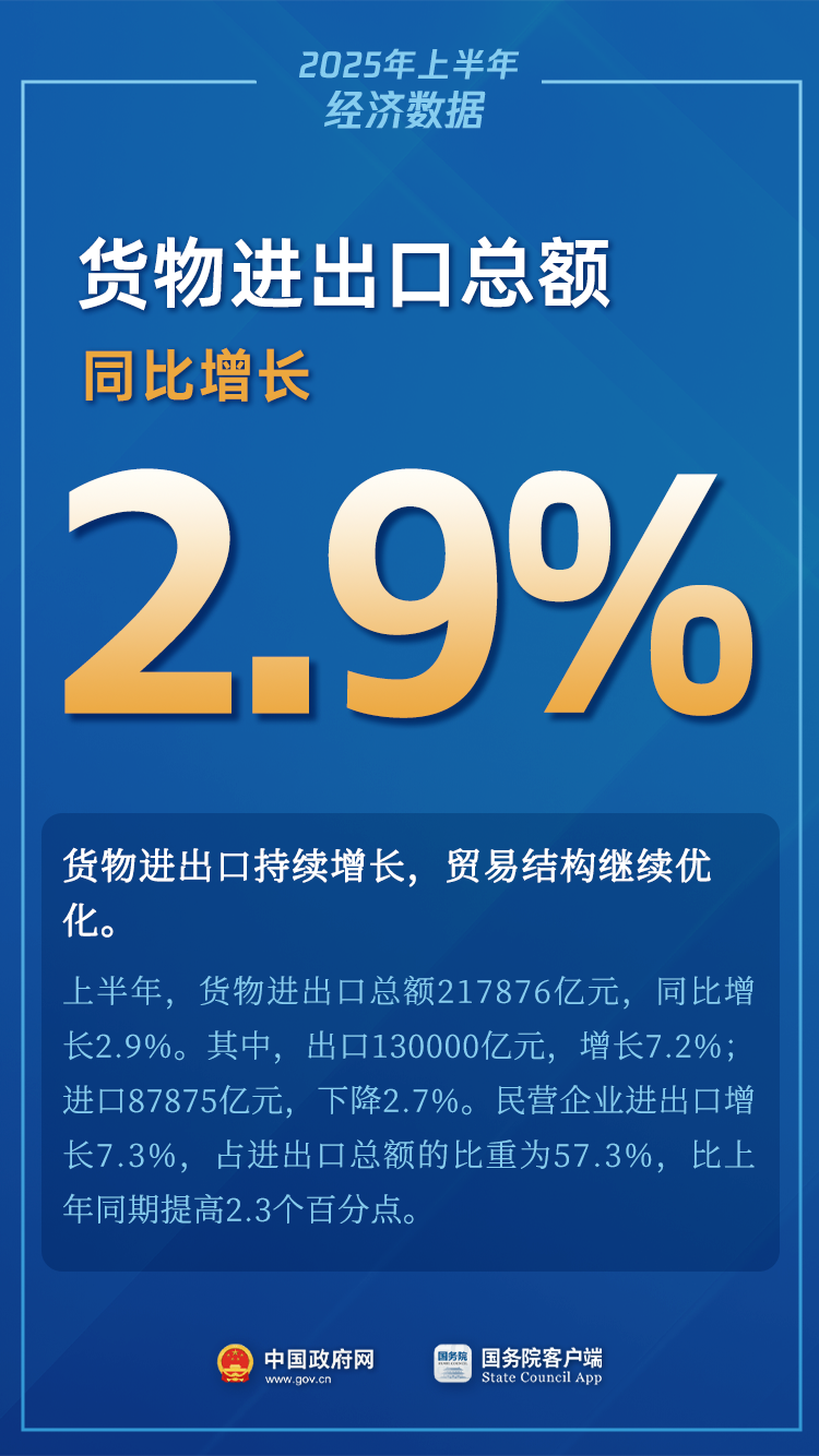 第二,多年来高质量发展大势和实践,凝聚了共识,积累了新动能,推进了经济再平衡,提高了经济可持续发展能力。从现实的一些因素看,一些先行指标和积极因素都在改善,显示高质量发展的良好势头。从生产来看,服务业经过多年转型后,对经济增长贡献率在提升。三次产业中,上半年服务业增加值占GDP比重59.1%,对GDP增长贡献率超过60%。从近几个月的先行指标看,服务业景气指数持续保持在50%以上的扩张区间,意味着服务业发展势头良好,经济增长中占比较大的产业会持续保持良好发展势头。从需求来看,消费是经济增长的“压舱石”、主动力。刚才我也向大家介绍了上半年消费市场趋于活跃,下半年在消费政策的推动下会继续保持良好发展态势,对经济增长的“压舱石”作用会继续显现。从出口来讲,我们实行多元化对外开放,构建多元化贸易格局,对单一国家的贸易依存度已降到个位数。上半年我国进出口增长2.9%,这是在二季度遭受外部巨大冲击情况下取得的,显示了贸易的韧性。从新动能发展来看,新动能继续成长,新产业、新业态、新模式继续保持较快增长速度。基于这些因素,综合判断,下半年中国经济稳定增长和高质量发展是有支撑的。
