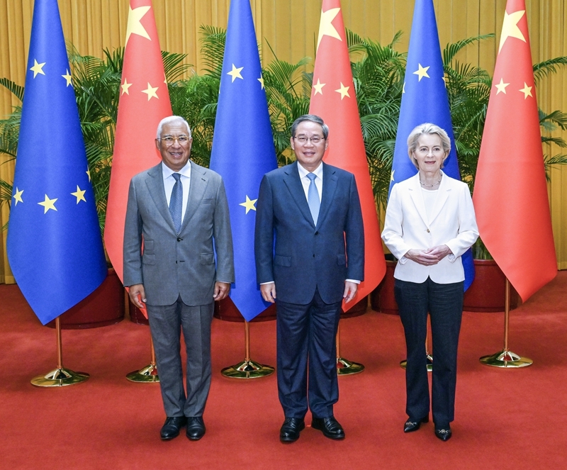7月24日下午,国务院总理李强在北京人民大会堂同欧洲理事会主席科斯塔、欧盟委员会主席冯德莱恩共同主持第二十五次中国-欧盟领导人会晤。新华社记者 饶爱民 摄