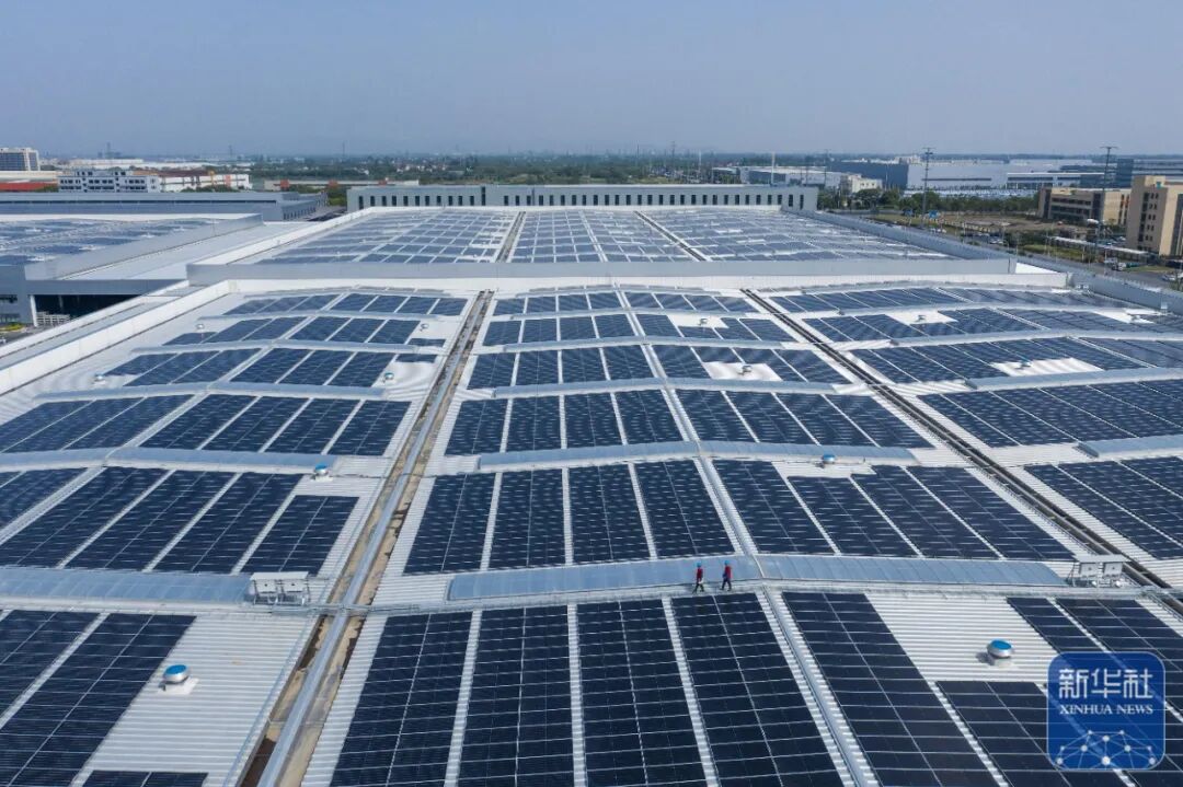 在吉利汽车长兴基地厂房屋顶上,国网湖州供电公司运维人员对刚刚投运的企业光伏设备开展巡检工作,保障光伏发电设施设备的运行安全与发电效率(无人机照片)。新华社记者 徐昱 摄